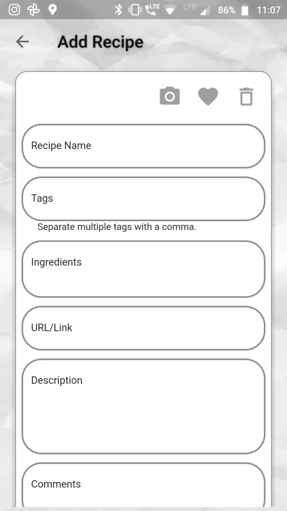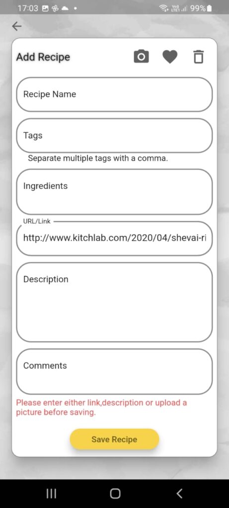 - Type in all the details of the recipe that you would like to save. A recipe should have either link, description or an image (can be screenshot, photo from a book etc).