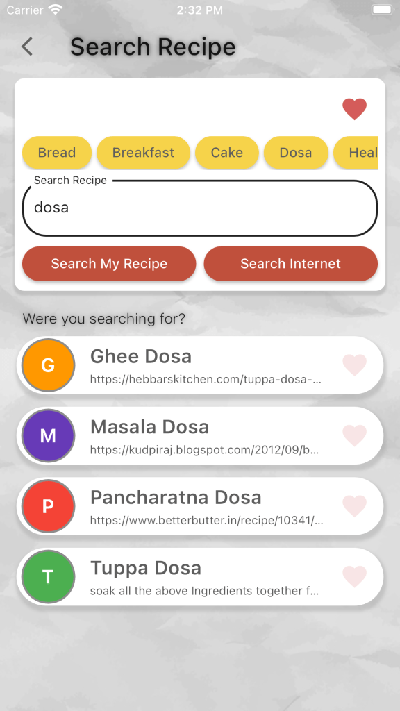 - Click on search Icon to search the recipes you saved.